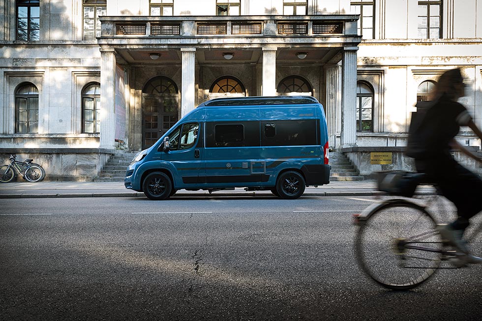 Free 540 Blue Evolution er en annen nyhet fra Hymer. Med sine 5,41 meter befinner den seg helt i andre enden av skalaen. Den kompakte nyheten har fokus på å være sporty og moderne. Et to-tonet design i stormblå metallic-lakk i kombinasjon med det svarte pop-taket gjør Free 540 Blue Evolution til et blikkfang. Pop-up-taket gjør at bilen har soveplass til fire personer, til tross for de kompakte målene. Free 540 er bygget på Fiat, og vil bli levert med det nye Fiat-multimediasystemet med en sju tommers navigasjonsenhet. Takket være det integrerte Isofix barnesetefestet, er Free 540 Blue Edition også egnet for unge familier.