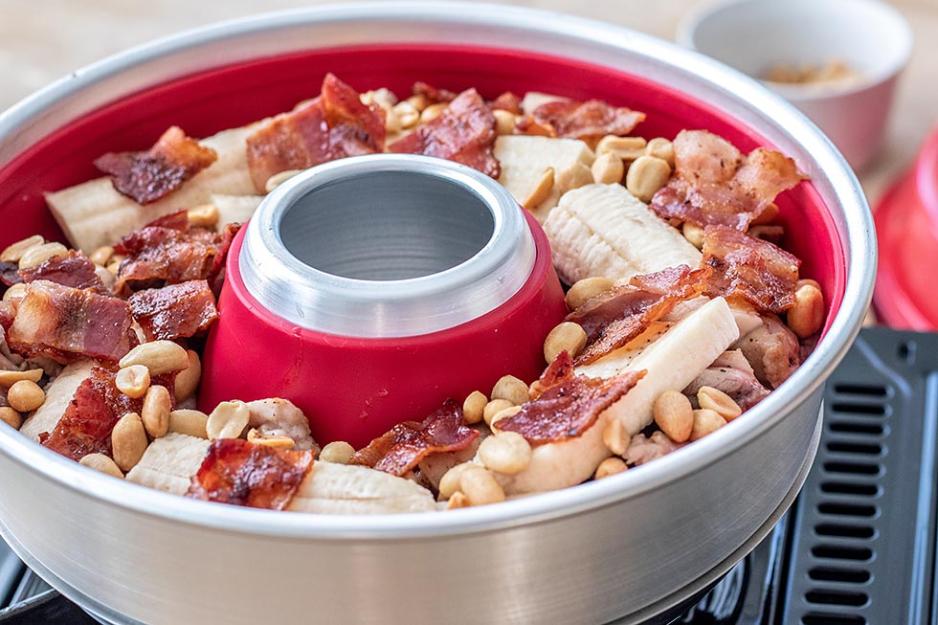 - Smør formen. Legg kyllingen i bunnen av formen. Skjær opp baconet, legg det på kyllingen, men spar litt til garnityr. Legg på bananskiver og dryss over peanøtter.