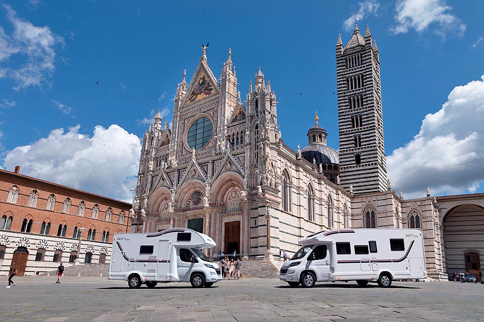 Giottiline har to bybobiler: 54T og 60T. De er så lange som navnene antyder, 5,4 og 5,99 meter. Ellers mangler det ikke på halvintegrerte og integrerte bobiler i sortimentet: Hele ti i Siena-serien, med lengder fra 5,99 til 7,4 meter; seks modeller i Therry-serien, fra 6,99 til 7,39 meter lange; to G-Line-modeller. Mer informasjon finner du på giottiline.com.