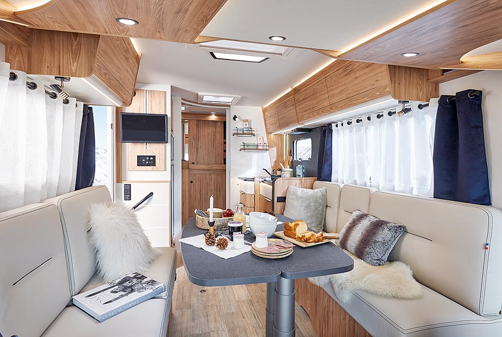 Flere og flere av sittegruppene til Pilote blir av sidesitter-typen, fremfor den tradisjonelle L-sofaen. Løsningen kommer på modeller helt opp til den store Galaxy G781, som er 7,81 meter lang. I noen år har Pilote jobbet med tre forskjellige utstyrsnivåer på bilene sine. For sesongen 2021 vil de endre dette, og tilbyr i stedet to nivåer: Essentiel og Sensation. Begge versjoner inkluderer nå mer utstyr enn de gjorde før. Det som også er nytt, er at modellene med AL-KO-chassis vil komme i Essentiel-design. Innvendig kan du få møblene i to versjoner: Country og Aspen.