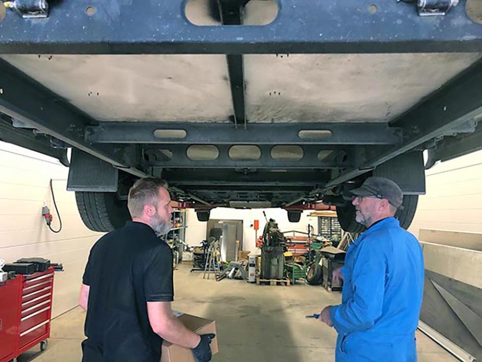 Første punkt etter ankomst var å få bobilen i riktig arbeidshøyde. Den kraftige løftebukken gjorde det enkelt å kunne gå under bobilen og få tilgang til chassiset, hvor alle delene skal. En hel pall med pappesker stod klar.