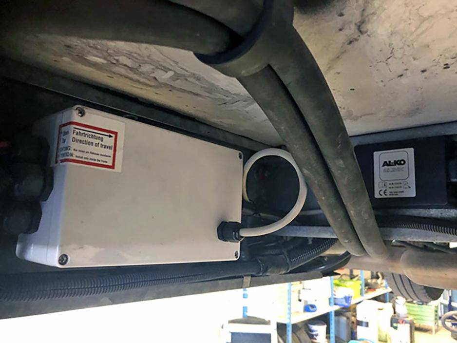 Da HY4 ble montert på bobilen min var ikke AL-KOs løsning for fjernstyring tilgjengelig. Den kom noe senere, og derfor satte jeg kursen mot Tilhengerservice i Skien for andre gang. Montøren hadde på forhånd fått tilsendt alt utstyr for oppkobling av 2Link, som app-løsningen for styring av HY4 heter. Monteringen var langt enklere denne gangen: Bobilen ble løftet opp og en ekstra boks ble montert like ved HY4-kontrollsenteret. Disse ble så koblet sammen, noe som tok en snau time. Ikke bare gjør løsningen det mulig å styre støttebeina med en smarttelefon eller nettbrett, du får også en vektfunksjon.