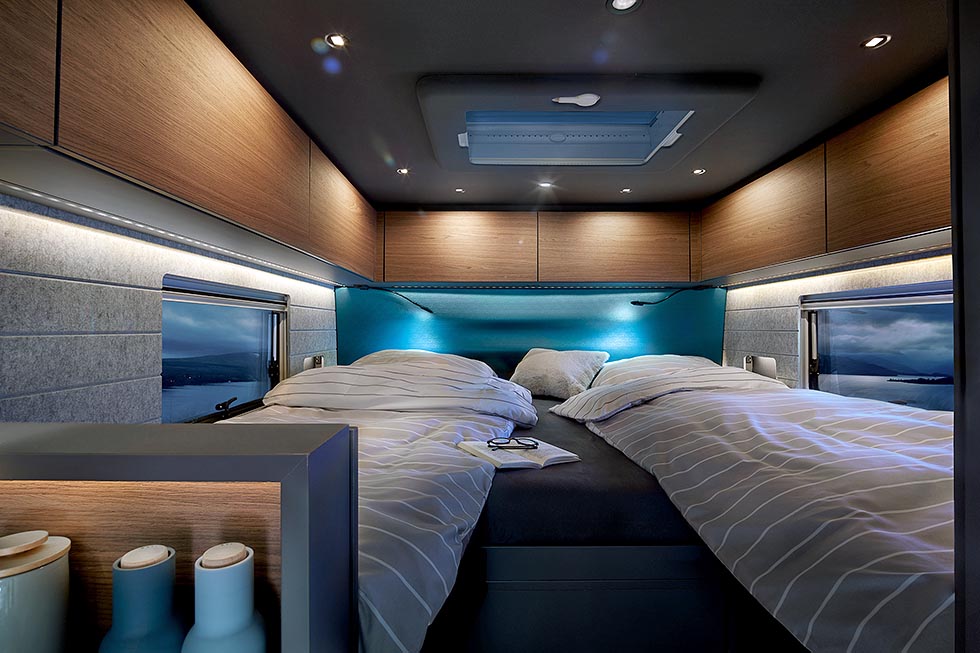 Det tilbys én modell med dobbeltseng (140x200cm) og én med to høye enkeltsenger. Sistnevnte kan man re opp til en bred dobbeltseng. I front er det en senkeseng som går helt frem til frontvinduet. Den er uvanlig pent integrert i taket, og frontplasseringen gir god utnyttelse av plassen.