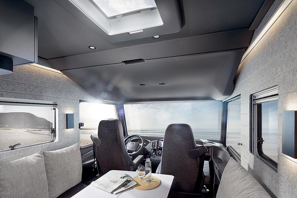 Kjøkkenet har et unikt, elektrisk drevet heveskap, eller kanskje mer korrekt: En hevehylle. Mens du kjører senkes denne ned i kjøkkenbenken, noe som gir god romfølelse innvendig i bobilen. Når du ønsker fred og ro på soverommet kan hyllen heves og en skyvedør trekkes inntil, slik at du plutselig har et helt separat soverom.