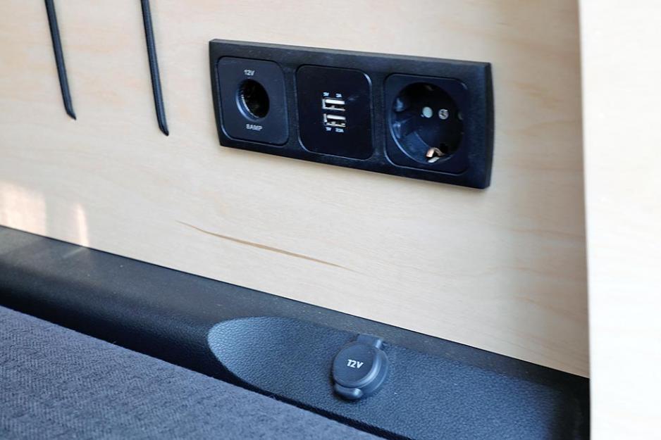 Eget bodelsbatteri, 110 watt solcellepanel, gass-/narkosealarm, PortaPotti-toalett, Webasto dieselvarmer, takluke, 230V strøminntak med to innvendige stikkontakter. I tillegg er det fire innvendige LED-lys og hele seks USB-ladekontakter. Under bordet er det lagringsplass som passer nøyaktig til en PortaPotti, som er standardutstyr i denne bilen. Er du nøden er det bare å ta den med seg til skogs, men det er kanskje lurt å vente til frokosten er ryddet av bordet?