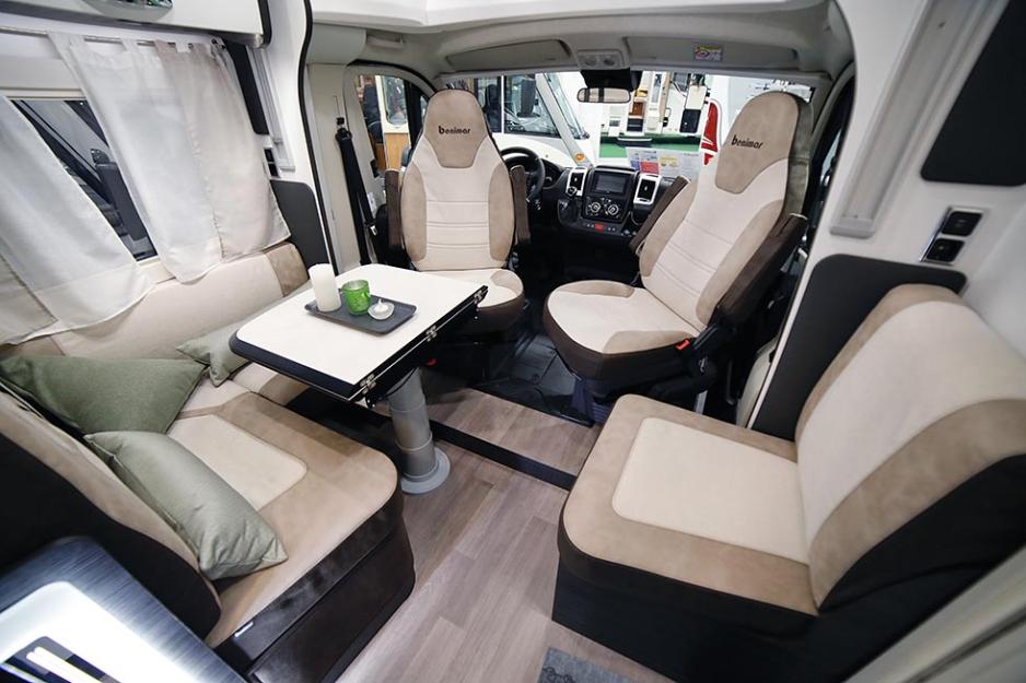 Benimar er unike på flere måter. En av dem er interiøret. Designet skiller seg ut. Her er lyse skapdører, mørkt treverk og lysebeige tekstiler med mørkebrune detaljer. Store kontraster, og en aktiv lyssetting. Det ser rett og slett veldig moderne ut. Testbilen er registrert for fire, men rundt bordet i L-sittegruppen er det plass til fem.