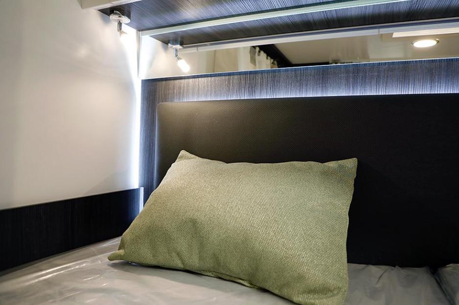 Det skal sies at den elektrisk betjente senkesengen ikke er spesielt godt integrert i takløsningen. Men, det er plass til dyne og pute her selv med sengen i høy posisjon - og det er en praktisk detalj som (utrolig nok) ikke gjelder alle senkesenger.