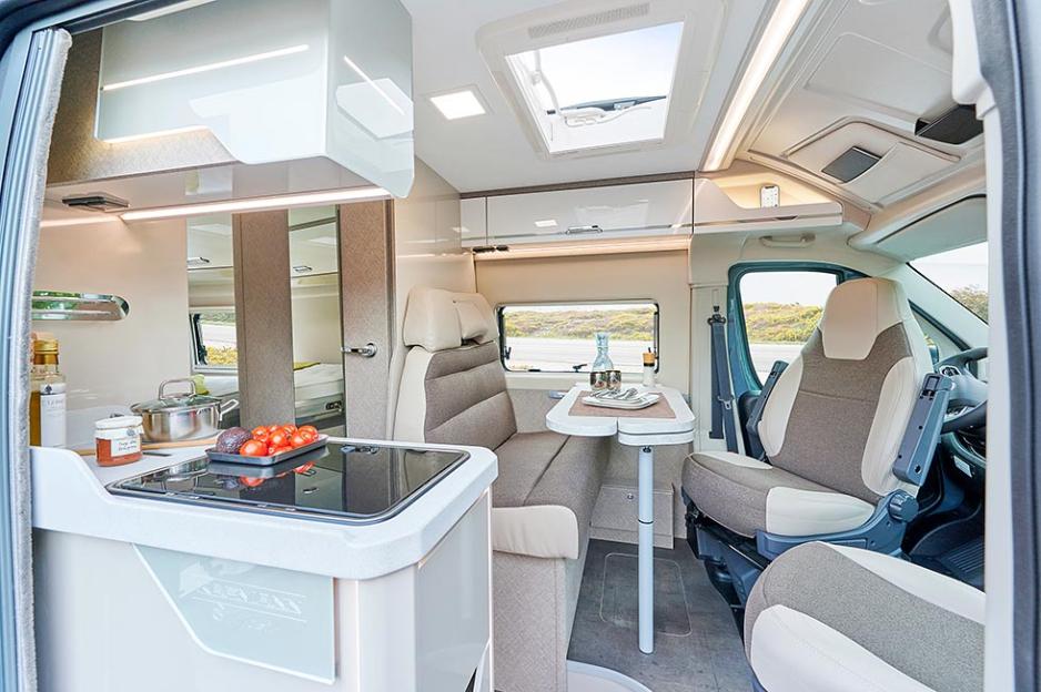 Vi vil også tro at materialet bidrar til å dempe lyder. At det i tillegg er stilig gjort, og at Karmann Mobil har brukt designkrefter på å få det til å harmonere, er veldig tydelig. Det råder harmoni med lyse nyanser av offwhite, beige og kaffe-farger.