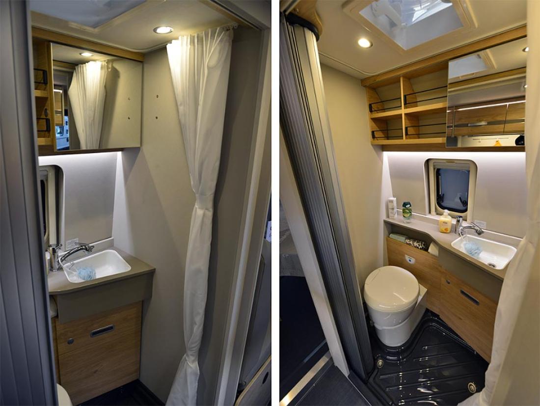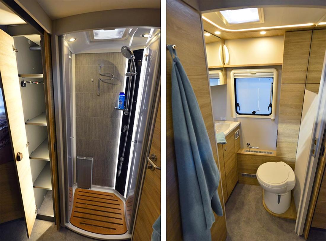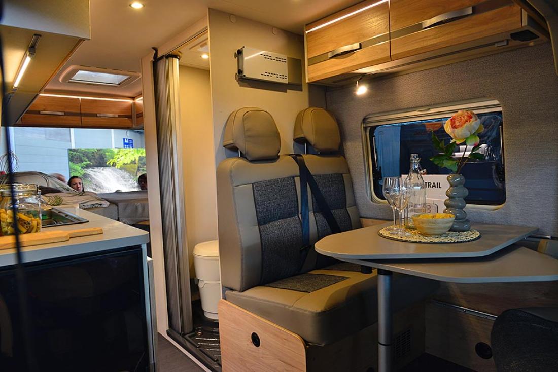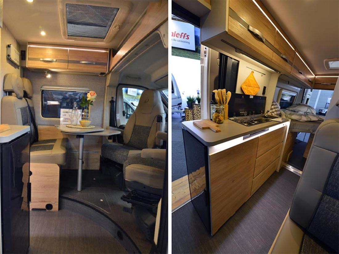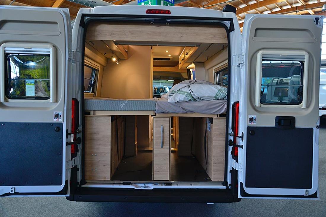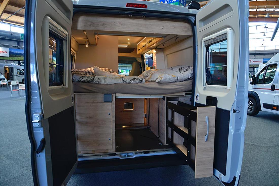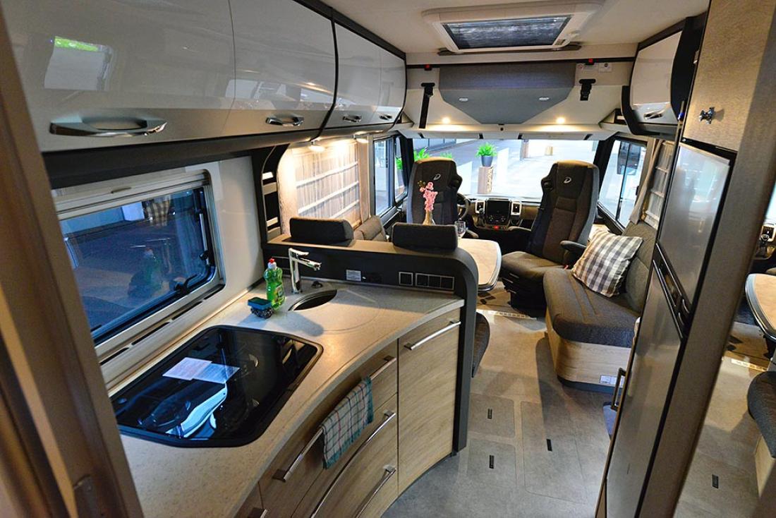 Toppserien XLi har blitt redesignet fra bunnen av for 2022-sesongen. Utvendig får den likt utseende som sine søsken. Jeg opplever at det nye designet får bilen til å se mindre ut. En ren illusjon, dimensjonene er de samme. Innvendig er det en koselig atmosfære. Dethleffs liker å trekke frem den nye bakluken, og jeg synes selvfølgelig også at den gir bilen et kraftig uttrykk, men jeg ble mer imponert over de nye lastelukene som mangler håndtak. Du trykker for å åpne og trykker for å lukke. Det gir et renere utseende, men fremfor alt kan du åpne garasjen med begge hender opptatt, det er bare å gi døren en liten dytt. Innvendig er det mulig å gi avkall på den lille sofaen inne ved døren til fordel for en kommode. Mer lagringsplass, men også mulighet for 32" TV. De som er redde for å miste fotskammelen som den lille sofaen vanligvis tjener som kan roe seg, den nederste skuffen har et polstret lokk bare for å hvile slitne ben.