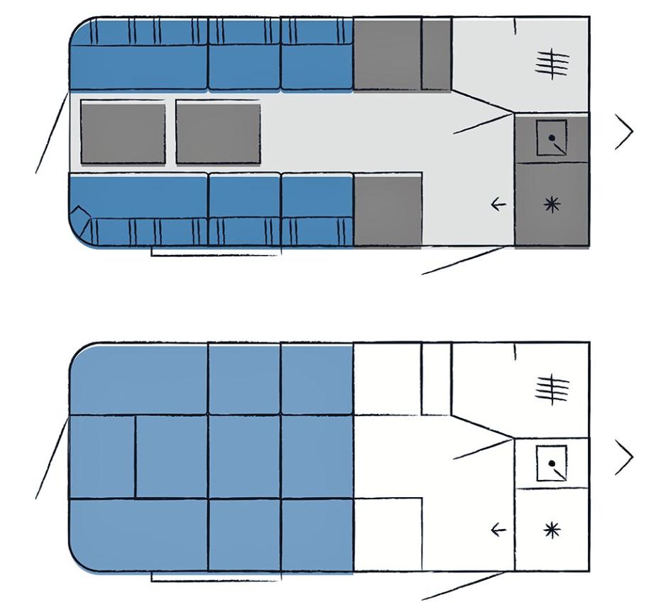 Den nye serien kommer med tre modeller som i utgangspunktet har lik interiørløsning, men tre ulike lengder på 360, 420 og 450 cm. Her er det en bakerst en sittegruppe som res opp til seng. Og det er her forskjellen på de tre modellene ligger. Jo lenger vogn, jo mer sitte- og soveplass. At det er en stor dør på bakveggen, er ikke tilfeldig. Det gir fotovennlige muligheter fra sengen. Perfekt for en ung Instagram-generasjon.