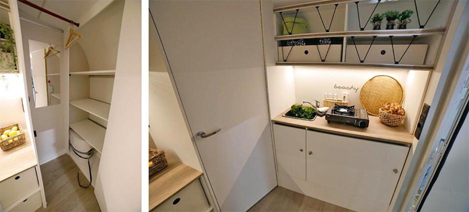 Vi så vognen både på Caravan Salon i Düsseldorf og på Caravanmessen i Lillestrøm. Bildene er fra den norske messen, for i Düsseldorf var det rett og slett vanskelig å komme til, da publikumskøen var lang. Vogna har ikke et tradisjonelt kjøleskap eller koketopp. I stedet kan den utstyres med en kjøleboks og et portabelt gasskokeapparat. Tilsvarende kan den leveres med et portabelt Porta Potti, som kan plasseres i garderoben.