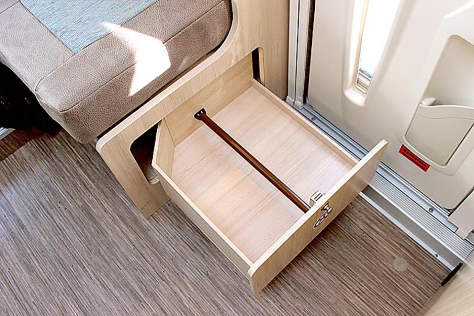 Oppbevaringsplassen var bra på kjøkkenet og badet var helt greit. Det samme med overskapene, det var plass nok. I sidesitteren var det ikke bare et lite skoskap, men en skoskuff til å trekke ut. Praktisk. Kun hengeskapet var en skuffelse.