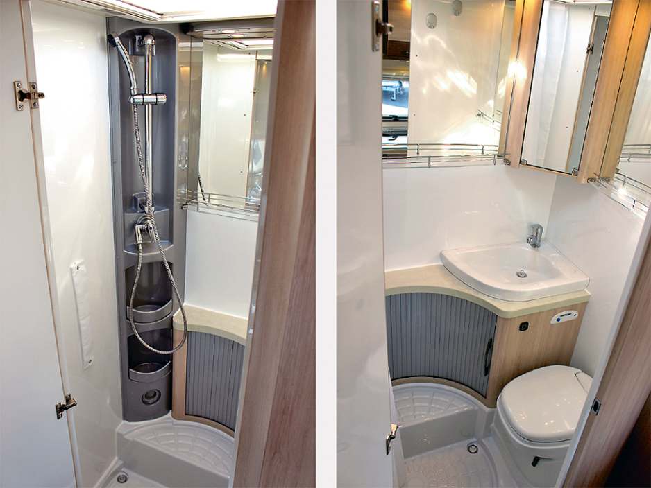 Toalettrommet måler 110 x 90 x h 187 cm, og du dusjer i selve rommet. To forheng henger på en skinne som går rundt den sentrale delen av rommet, men de når ikke helt rundt. Etter en dusj er gulvet vått, og flere andre steder vil få en sprut. Mellom konsollen hvor selve dusjen med kran er anbrakt og vaskebenken, var det ikke fuget. At det kommer vann her under dusjing er vanskelig å unngå, men det er enkelt å fuge selv med klar silikon. Fugingen mellom vegg og dusjgulv var også mangelfull med synlige åpninger. Hele dusjen forekom oss derfor noe halvhjertet. Vasken derimot fungerer bra, det er god plass til å bøye seg ned. Toalettet var plassert i en trang nisje, trangt på begge sider.
