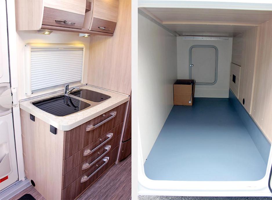 Vannkranen er plassert mellom glasslokkene til bluss og kum, og må stilles rett når lokkene vippes opp. Står selve kranen på skrå, tar lokket denne med seg opp, og vannet fosser ut mellom kum og bluss. Men dette venner man seg fort til å sjekke etter et par uhell. Kjøleskapet fra Dometic står til høyre for benken, det er et RML 8330, såkalt «slim tower», da det er betydelig smalere enn de vanlige skapene. Kjøleskapet er 135 liter stort med et lite fryseskap på 12 liter plassert inne i skapet - som kan tas ut om ønskelig. Kjøkkenet har ikke avtrekksvifte, men et luftevindu og en takluke like i nærheten gjør jobben. Det er LED-spotter i tak og under overskap.