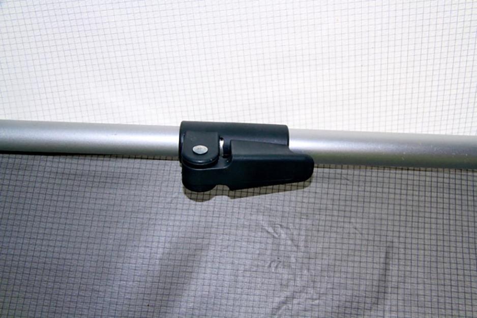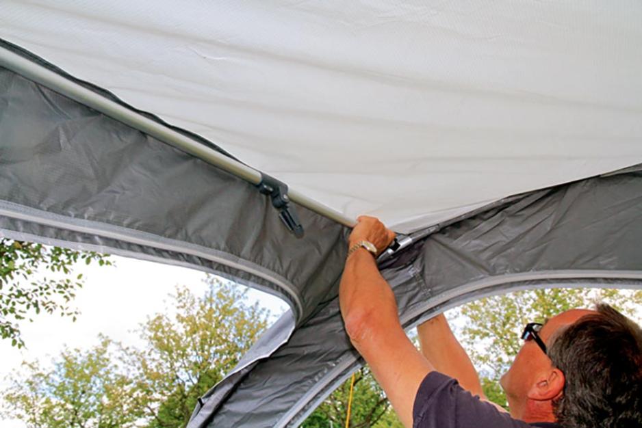- Monter de to stengene som sikrer teltet mot vognen. Ved hjelp av de påsydde putene som klemmer mot vognsiden får du en tett og trekkfri overgang.