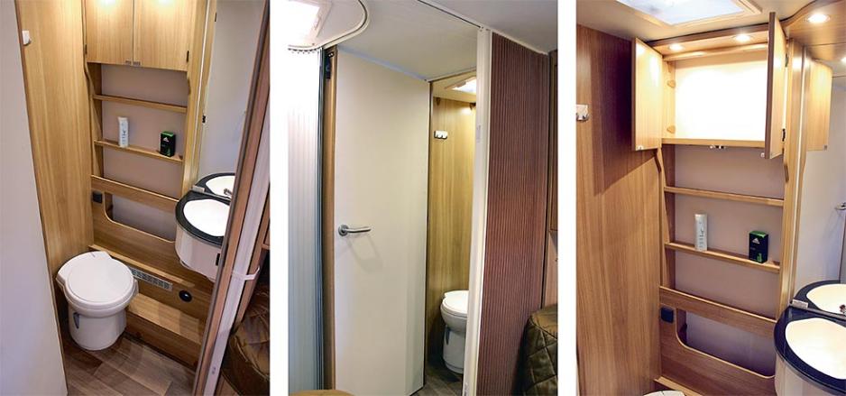 Toalettrommet og dusjen er plassert på hver side av midtgangen, i forkant av soverommet. Toalettromsdøren kan lukkes opp og stenger dermed framover i bilen. I tillegg er det en foldedør mellom dusj/ toalettrom og sengene bak. Fungerer bra som sanitæravdeling! Toalettrommet måler 94 x 80/58 x h 188 cm lukket, og fungerer bra. Men om du skal vaske deg i ansiktet må du bøye deg ned og døren må lukkes opp, hvilket ikke er noe problem når det stenges av. Dusjen måler 82 x 68 x h 194 cm, og gir tilstrekkelig plass. Bra så langt, men vi har et lite ankepunkt på oppbevaringsplassen. Et lite veggskap uten hylle er alt som egner seg for oppbevaring under kjøring. På undersiden er det hyller med lav kant som bare egner seg for pyntegjenstander når bilen står stille. Her var det et vindu i en fransk utgave av bilen. Det var heller ikke skap under vasken, så dette var et minus.