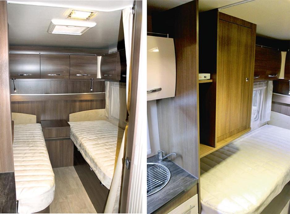 Begge enkeltsengene bak måler 205 x 85 cm. Det er overraskende lange og brede senger til en slik kompakt bil å være. En tolv centimeter tykk madrass ligger på fjærende treribber. Fra gulvet og opp til madrassen er det 69 cm som er en bekvem høyde. Mellomrommet mellom madrassene kan fylles ut i en lengde av 177 cm fra hodeenden og ned. To klesskap er festet på veggen over fotenden av sengene. Det bredeste bygger 77 cm fra vangen mot kjøkkenet ved fotenden av senga og innover. Og det i en høyde av 40 cm over madrassen. Forsøk viste at det fortsatt var mulig å trekke opp knærne, det så verre ut enn det var. På høyre side bygget skapet 57 cm innover senga.