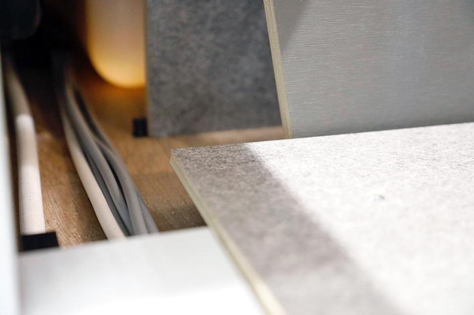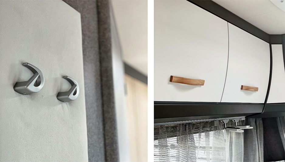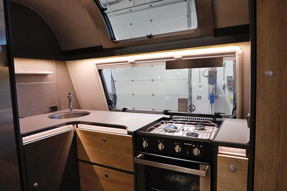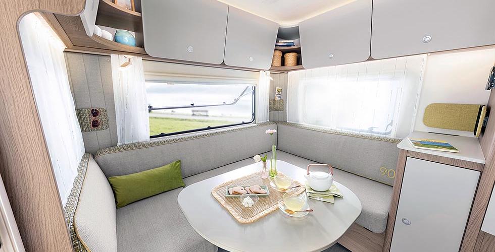 Dekorløsningen kalles Amberes Oak og består blant annet av ekte trehåndtak i en matt lakkert finish. Kontrasten til de matt hvite overskapene er visuelt elegant. Spesielt siden det er brukt en relativt mørk grå farge på vegger, skapstammer og møbler. Denne relativt mørke fargenyansen bidrar til å dempe helhetsinntrykket, og det er kun frontveggen og taket som er helt lyse. De nederste skuffene på kjøkkenet er i samme mørke gråfarger, mens de øverste er i lyst treverk. Det kan være store forskjeller på lysinstallasjoner i en campingvogn. Denne modellen plasserer seg i øverste klasse, med mange indirekte lyskilder, supplert med spotter på skinne og direkte lys.