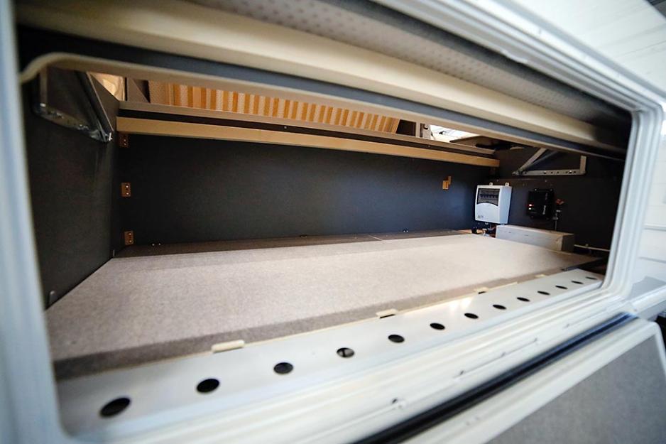 Under begge sengene er det også lagringsplass, den ene har kun adkomst innenfra, den andre har også en utvendig luke. Kompakte stoler og et lite bord vil kunne plasseres her. Under sofaen er det også plass til å lagre ting. Men dette er ikke så lett tilgjengelig. Både rygg- og sitteputer må fjernes for å få tilgang.