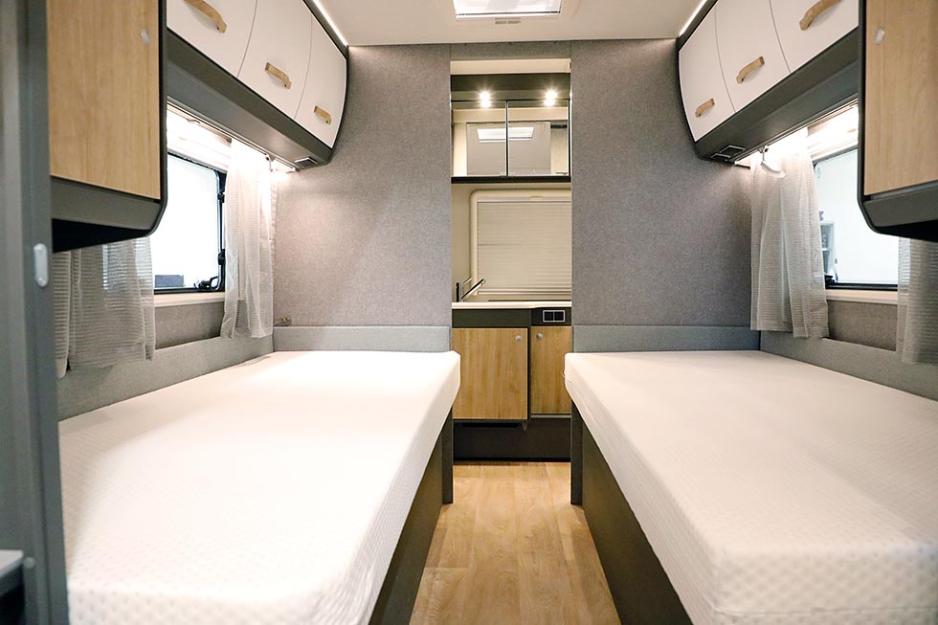 Når vi kommer inn i vognen, ser vi at den har en klassisk interiørløsning. Forfra og bakover er det kjøkken, stue, soverom og bad – på rekke og rad. Det er to enkeltsenger på soverommet. Det følger med ekstra sengebunn og madrass til å dekke mellomrommet. Dermed kan du lage én gedigen seng på rundt to ganger to meter. Derfor er også antall sengeplasser oppgitt til tre. Men dette er en typisk interiørløsning for to personer.