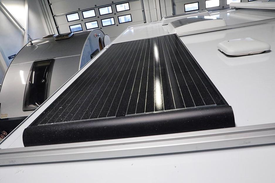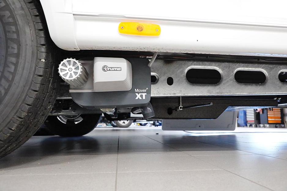 På taket er det montert et stort solcellepanel. Dette er av typen som har utlufting på undersiden, og er et meget effektivt panel som lader batteriene, også når vogna ikke er tilkoblet strøm. Nå skulle man kanskje tro at det ikke var så mye mer man kunne få på vogna, men det er det! Nemlig en praktisk mover fra Truma. Med den romslige batterikapasiteten har man kraft nok til å finparkere vogna takket være de elektriske motorene til moveren. Det er veldig praktisk på trange steder.