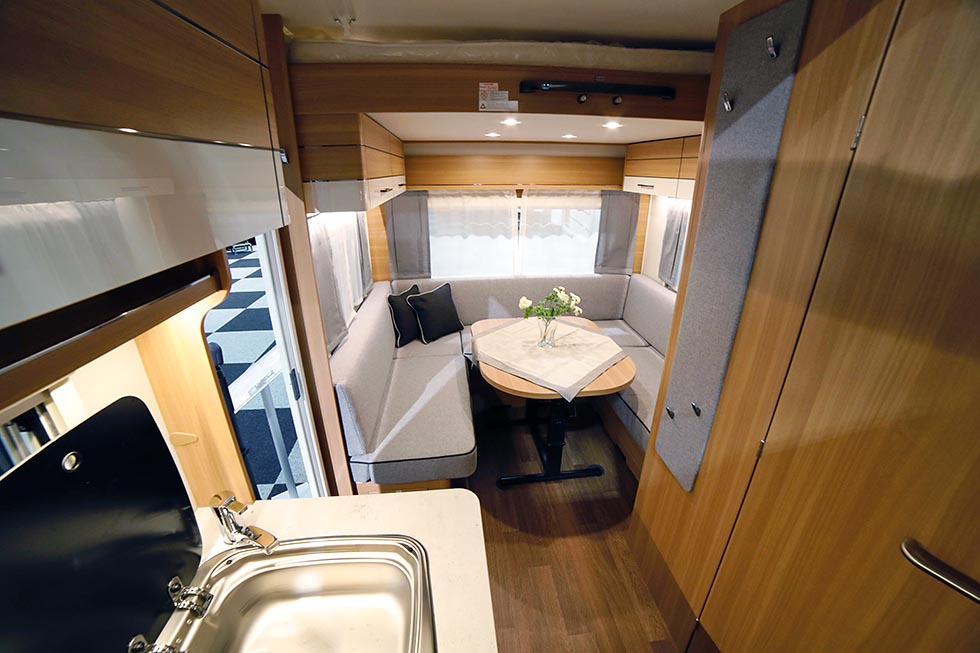For når senkesengen er ute av bildet åpenbarer sittegruppen seg. Den hesteskoformede rundsitteren er romslig og har plass til hele storfamilien. Det er relativt romslige overskap som er festet i underkant av senkesengen på de to kortsidene. Under sofaen er det som man kan forvente lagringsplass. Kjøkken og bad er plassert overfor hverandre. Ved siden av badet står kjøleskapet og det typiske romslige hengeskapet med Truma 3000-serie varmeren. Denne kombinasjonen med gassvarmeovn og romslig hengeskap har nesten blitt standard på kompakte vogner med luftbåren varme.