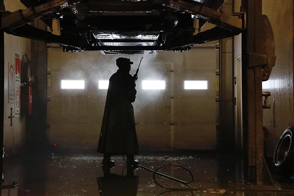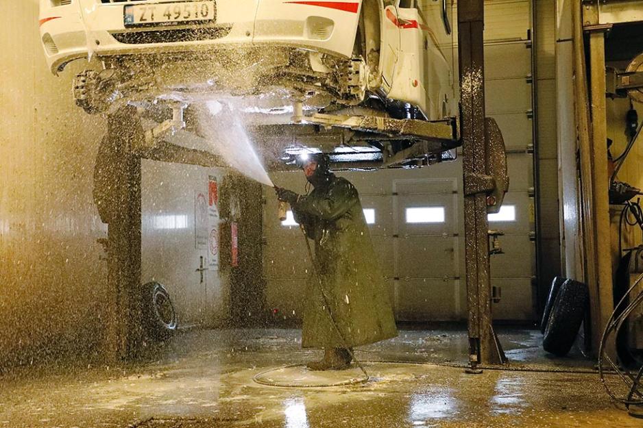 Første dag er satt av til forberedelser. Dekk og innerskjermer fjernes. Vaskemiddel og skummiddel påføres. Så høytrykkspyles bobilens underside. I etterkant har det vist seg at det er flere fagpersoner i bransjen som er skeptiske til nettopp å høytrykkspyle undersiden. Se egen rammesak. Etter en grundig vask er det ingen som helst tvil om at bobilen er ren under. Nå er det tørking som gjelder. Ventilasjonsanlegget hos Follo Antirustsenter er imponerende godt dimensjonert, og det er ikke tilfeldig at vaskingen skjedde på en fredag. Bilen får tørke skikkelig over helga.