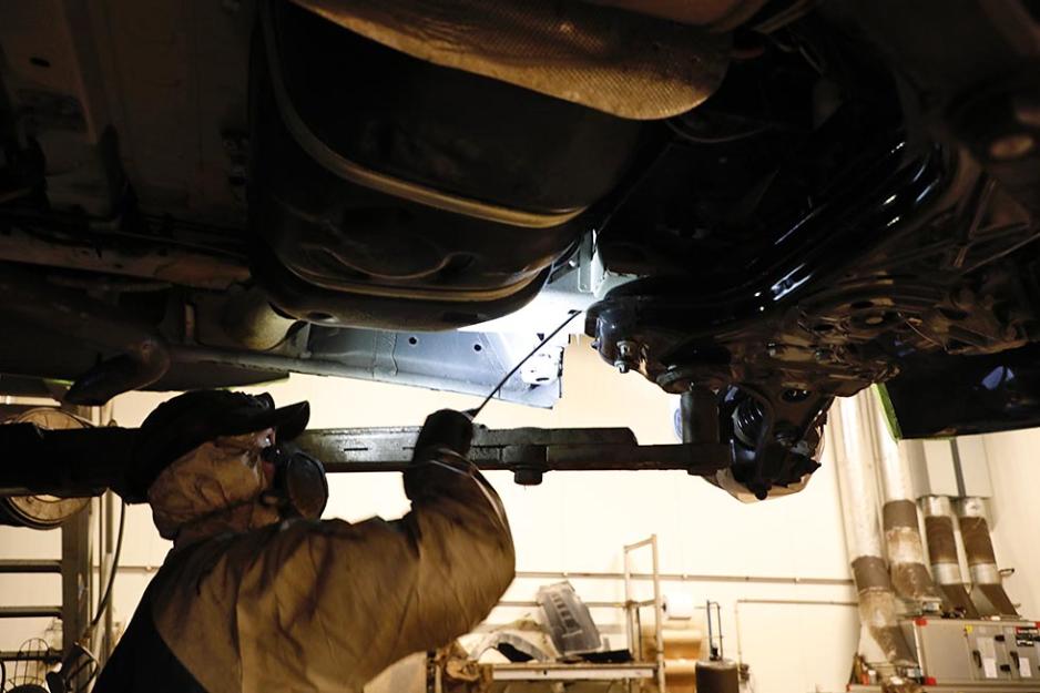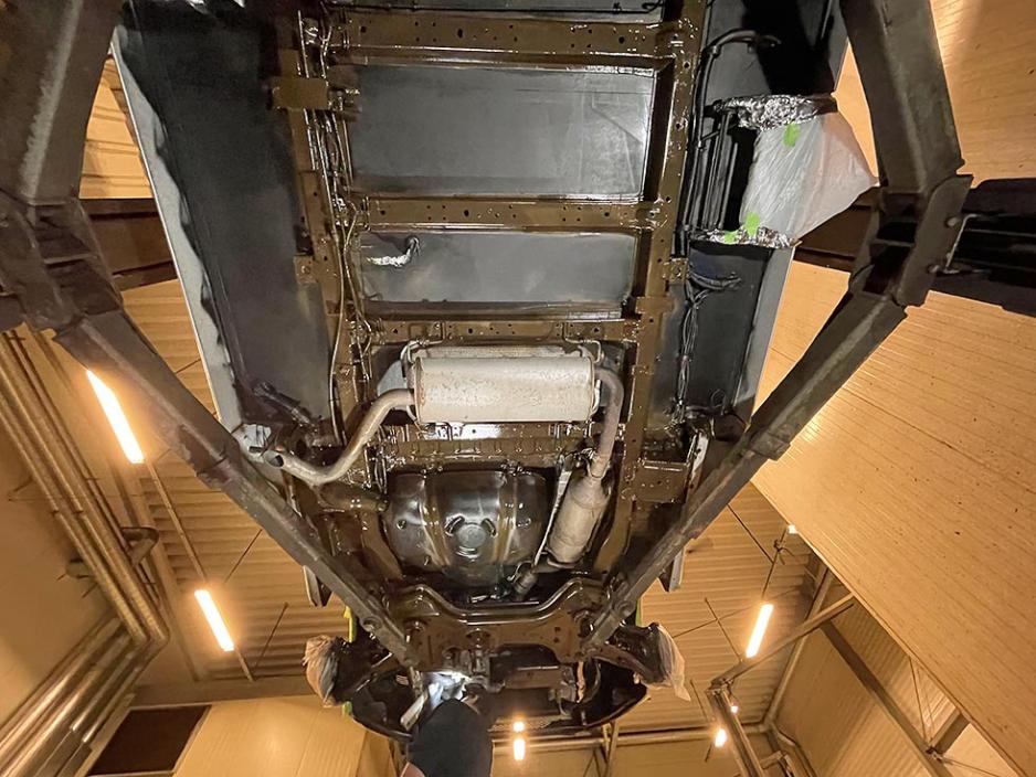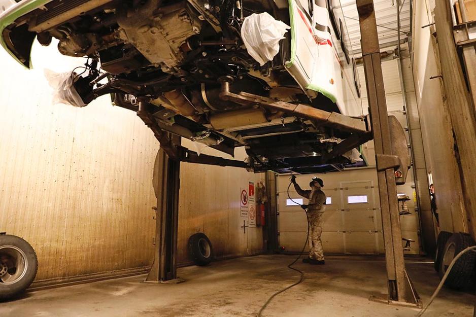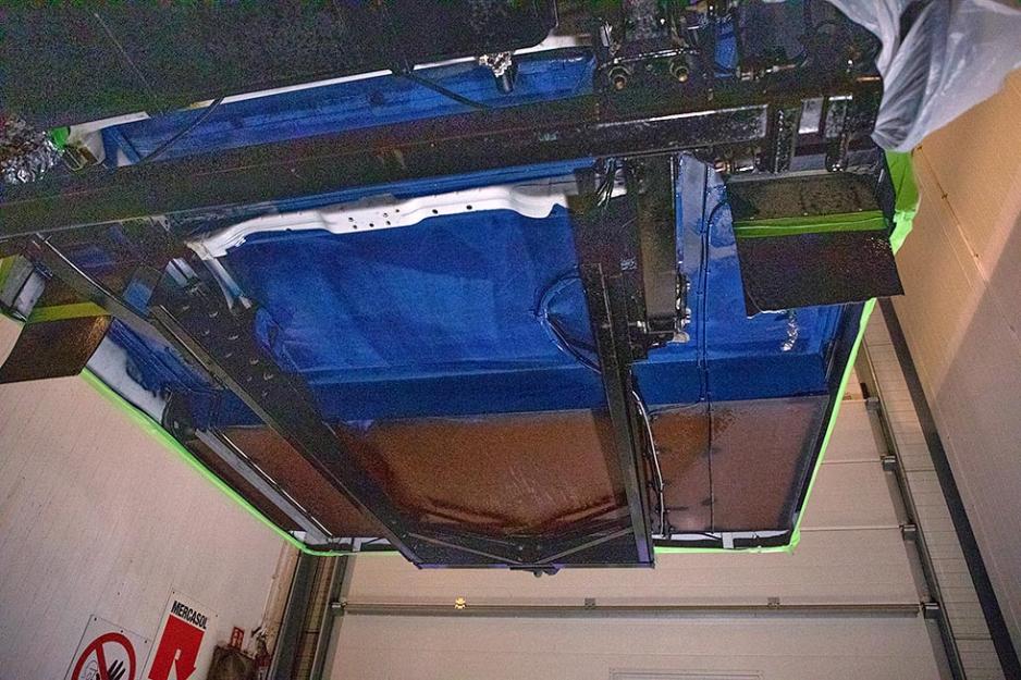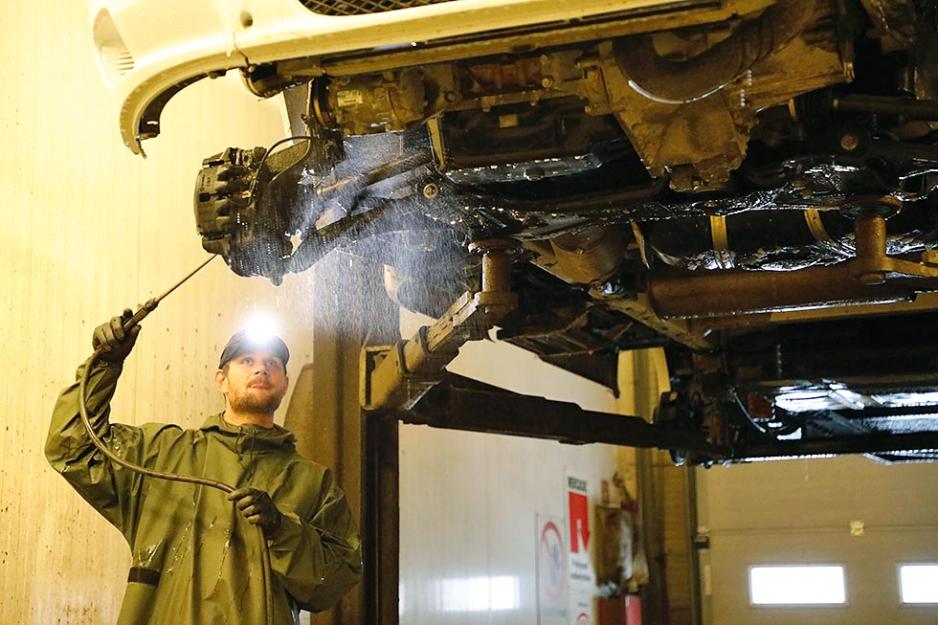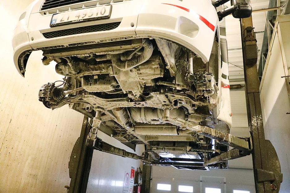 Hele fem ulike midler bruker Follo Antirustsenter når de skal understellsbehandle bobilens underside. Når alt er ferdig, og jeg kan se opp på bilens underside på løftebukken, tenker jeg det er synd ikke alle kan se resultatet. Selv om behandlingen gjøres for å gjøre metall og finérplater holdbare, har bilens underside ikke sett så bra ut siden den forlot fabrikken for åtte år siden.