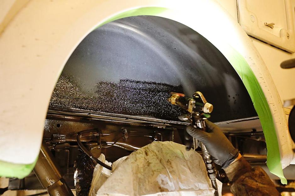 Turen har kommet til sprøyting av resten av metallet på bobilen. Nå skal det sprøytes under motoren og på bjelkene bakover langs bobilen. Etter sprøyting ser de store flatene plutselig ut som nye, med sin nye jevne brunfarge. Igjen etterlater middelet en farge for å lett se hvor man har vært. Ved flere av overgangene mellom metall og treplater bruker Tommy en papplate for å skjerme. Når han er ferdig, blir en kollega tilkalt for å gå over og sjekke at alt som skal behandles er behandlet.