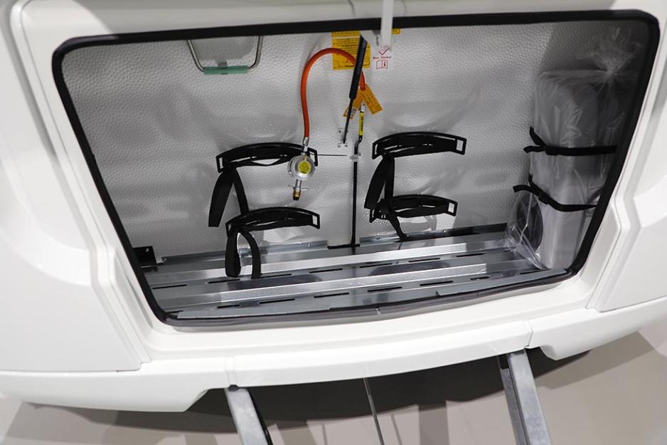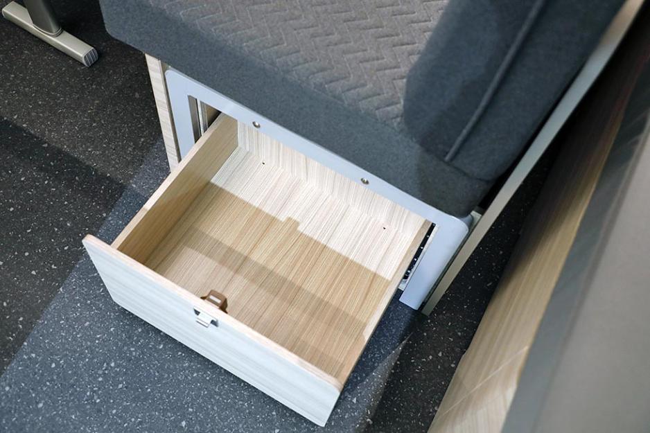 Det betyr at du har enkel tilgang til denne lagringsplassen uten å måtte løfte på puter og plater. Under den andre sittebenken er vannvarmeren plassert, og med en tilsvarende praktisk skuff.