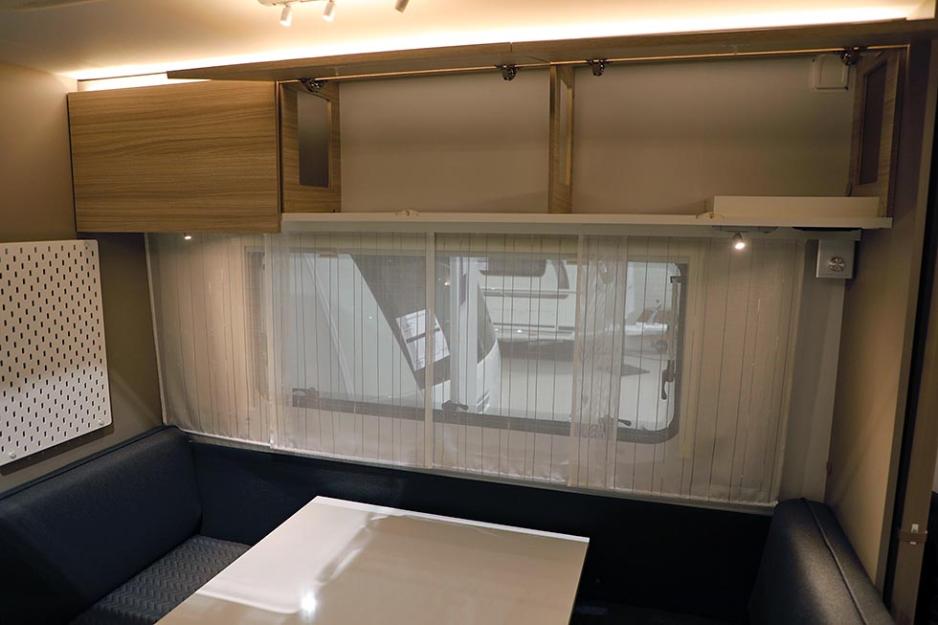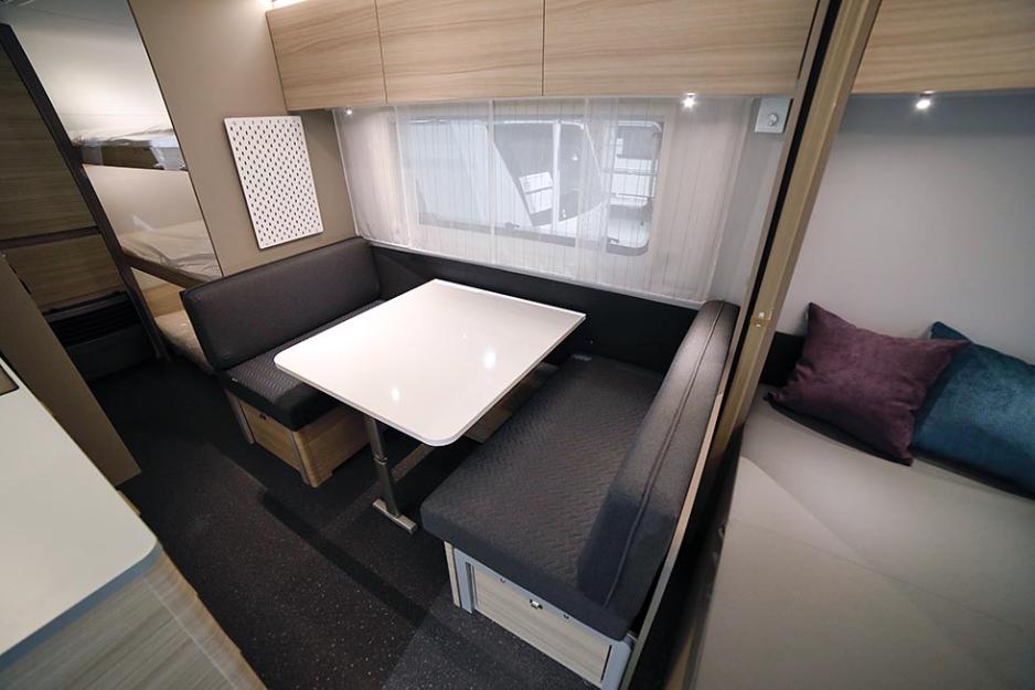 Produsenten kaller interiøret «nordisk stil». Det betyr lyse trefarger og struktur på alle skapdører og skrog til møblene. Tekstilene går i grånyanser, mørkegrått grovt vevd stoff i ryggputen, sitteputen er i en annen nyanse, og er fylt av dekorsømmer. Det går raskt å senke bordet, legge på puter og re opp til en romslig soveplass i sittegruppen. Her kan også to (barn?) sove tipper jeg. I så fall betyr det at denne vogna kan gi soveplass til hele sju personer.