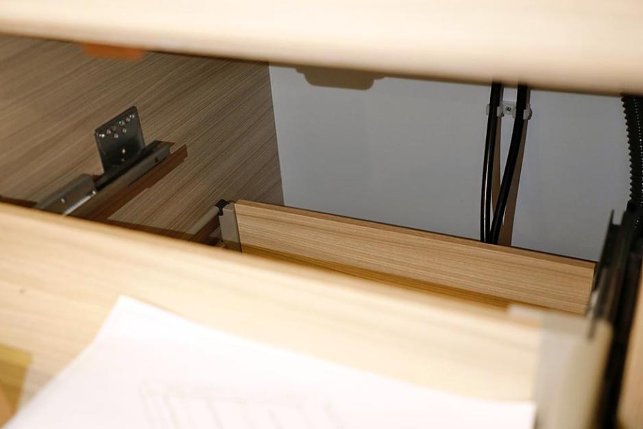 Halve sengen er leddet, og fjærbelastningen gjør at det er enkelt å løfte den for å få adkomst til lagringsplassen under. Og her er det plass til mye. Jeg ser for meg bord, stoler, leker og fotballer. Klærne vil man nok først og fremst plassere i overskapene.