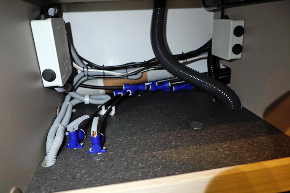 Fullt så imponert blir vi ikke når vi åpner skapdøren under kjøleskapet. Her er det også lagringsplass, men hvordan skal man kunne bruke den når to vannkraner er montert ubeskyttet på gulvet? En kjele eller to som sklir rundt her vil kunne utrette mye skade. Her burde vi kunne forvente en enkel beskyttelseslist, i det minste.