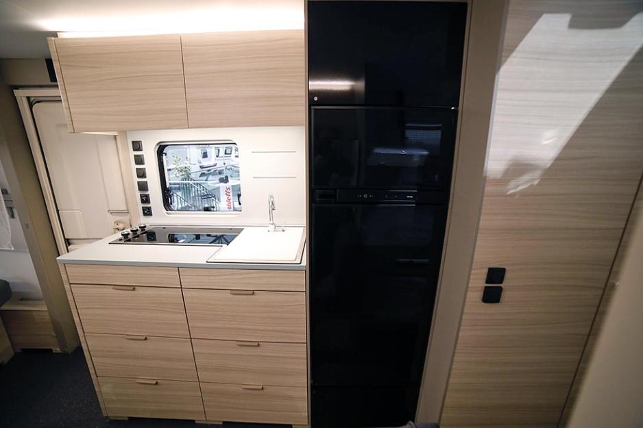 Stort kjøleskap med separat fryser på til sammen 156 liter er et godt valg for en barnefamilie. Oppvaskkummen har et plastlokk som er mer praktisk enn lekkert. Uansett hva man mener, vil man garantert sette pris på at det i praksis er en stor skjærefjøl. Koketoppen med tre gassbluss er integrert med vasken. Det betyr at det ikke er noen krise om det koker over. Det gjør også at det blir enklere å gjøre rent koketoppen.