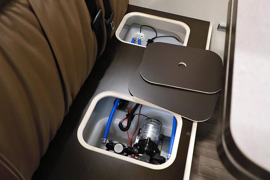 Vannsystemet drives av en Shureflo trykkvannspumpe fra øverste hylle.
