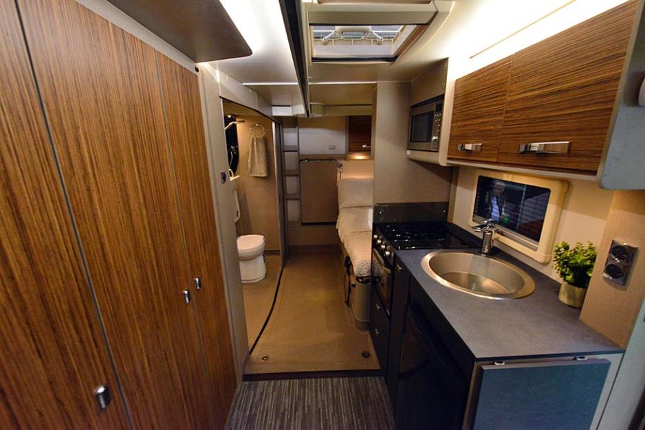 Coachbuilt tilpasser og bygger om et femtitalls bobiler hvert år. Utstillingsmodellen er et typisk eksempel på løsningene de leverer. Kostnaden for en slik ombygging som denne ligger på rundt 350 000 kr. Det er ikke mye igjen av originalbobilen, og jeg spør om de tar utgangspunkt i et tomt skall, eller om det er snakk om en standardbil?