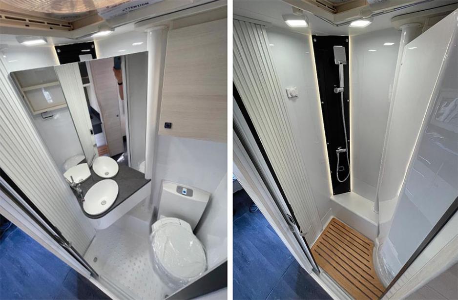 Det er ikke like stor opptur å komme inn på badet. Her er det hvit plast som råder, spesielt når smartbadet er i normalposisjonen hvor vask og toalett er tilgjengelig. Dusjen er langt stiligere med sin svarte bakplate og flotte trerist. For det skal ikke så mye til å løfte designen. Det er i tillegg viktig at luften kan sirkulere fritt bak møbler og skap i en vogn.