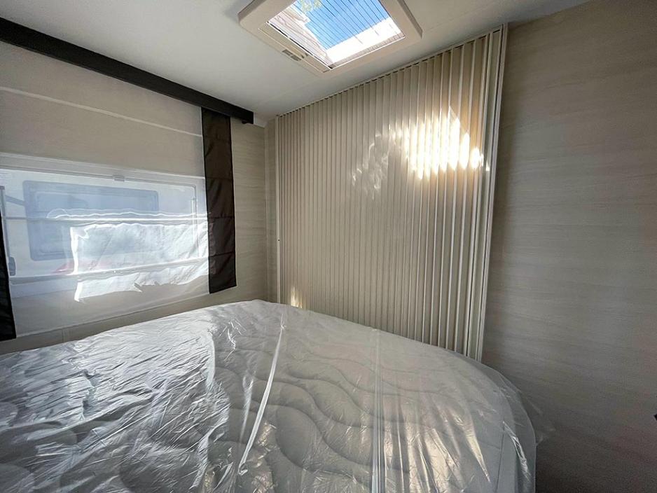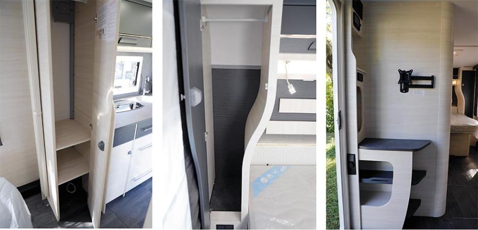 Den store dobbeltsengen er hengslet og luftdempet, slik at den er lett å heve for å komme til lagringsplassen under. Vogna har et stort hengeskap. Det er litt langt mellom hyllene kanskje, men masse praktisk lagringsplass. Hengeskapene ved hodeenden kunne nok vært innredet litt smartere med flere hyller i bunnen. Her kan du plassere jakker og korte kjoler, og hvis du skal ha med deg bunad må den uansett i det store skapet.
