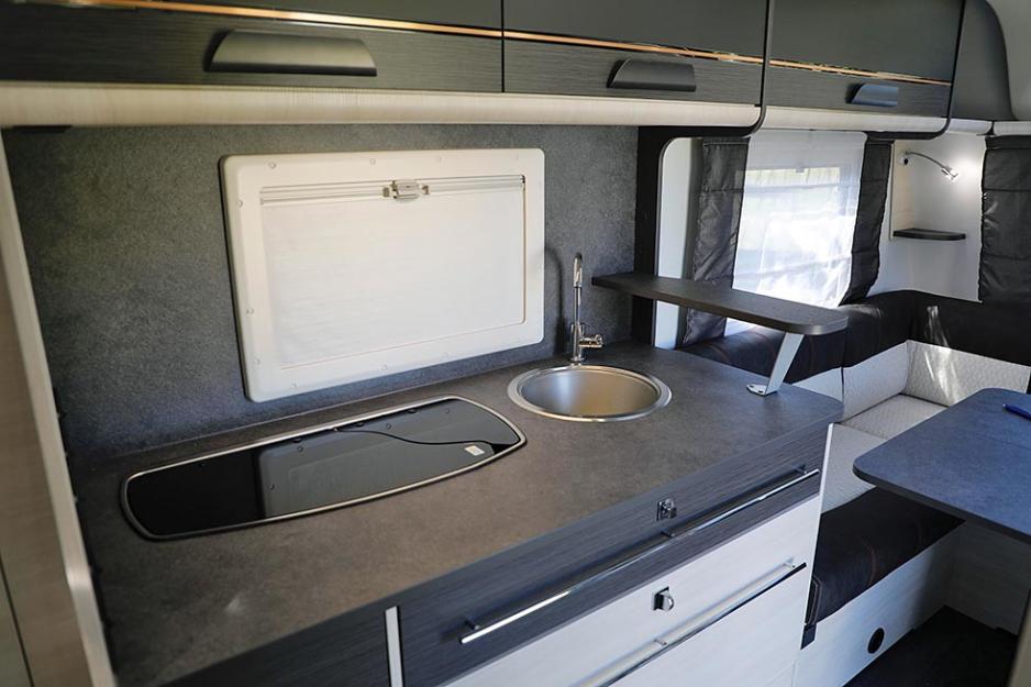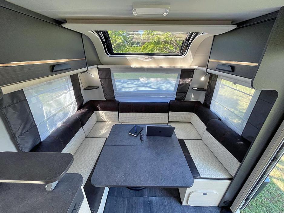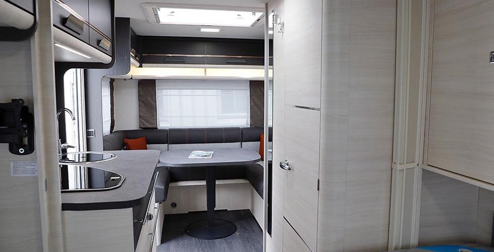 Jeg visste at Caravelair den siste tiden har gått for en designmessig sjarmoffensiv, og det er Artica 540 et godt eksempel på. Grå flater på benker, overskap, kjøkkenplate og bord. Og tofargede tekstiler med synlige sømmer, gir et flott førsteinntrykk.