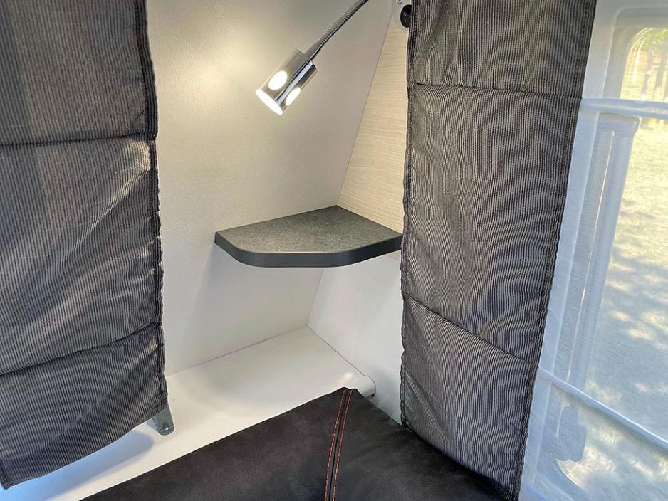 Myke linjer på sideskapene i hodeenden bekrefter at dette er en vogn hvor produsenten har lagt inn både tid og penger på designet. Spotlys på svanehals går igjen flere steder i vogna, og her er rikelig med indirekte lys. Jeg liker godt taklysene som er store firkantede og gir masse godt lys. Personlig synes jeg den gullfargede dekorlisten på overskapene gjør at det blir for mye av det gode, men det er en smakssak.