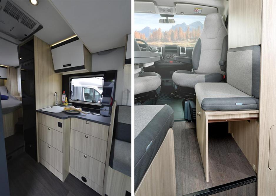 Nytt for 2023 er en kort (5,99 m) modell kalt C60 SP. En av modellens finesser vi likte godt var den uttrekkbare sidesitteren rett innenfor bodelsdøra. Dette blir nok en høyt verdsatt fotskammel for den som sitter i det bakovervendte førersetet.