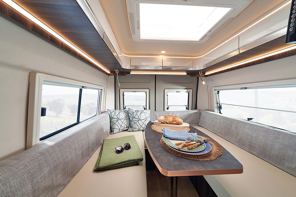 Det er dobbeltgulv på soverommet, noe som gjør at du får et fleksibelt lasterom og en behagelig sittehøyde i sengene. Et søylebord kan plasseres mellom sengene og det er også mulig å ordne et sete på bilens bakvegg og dermed få en U-formet sofa.