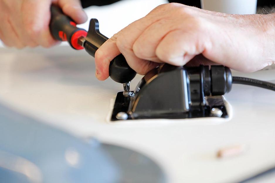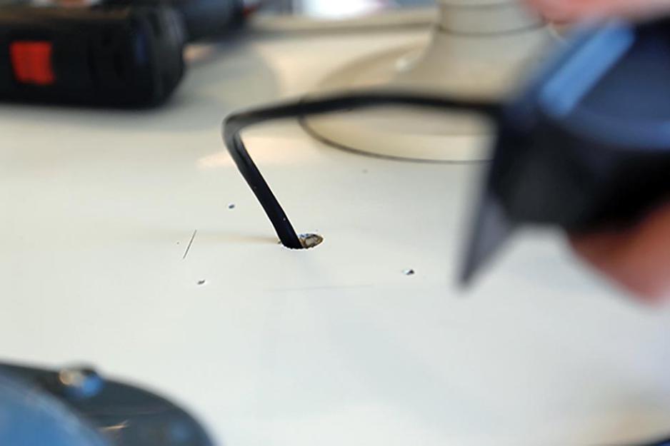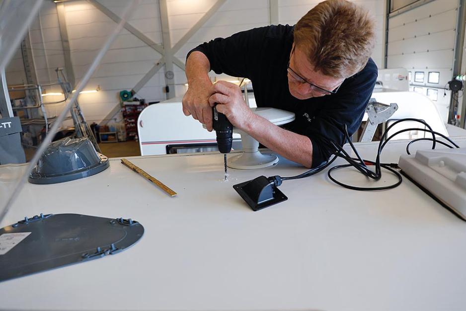 Mekaniker Roar er nøye med å måle nøyaktig plassering av hullet. Han har satt på et relativt tynt bor, til å lage selve hullet med. Når han er kommet gjennom, borer han det opp med et tykkere bor, slik at den litt brede kontakten i enden på ledningen får plass. For all kabling og alle kontakter er ferdig montert fra fabrikk. Den overskytende kabelen kveiles opp, og plasseres på et sted der det er til minst mulig sjenanse.