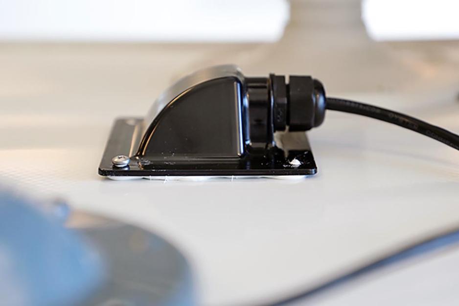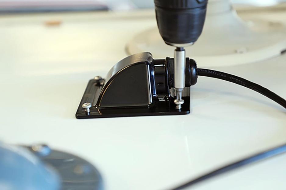 Når den langt mindre kabelgjennomføringen skal festes gjøres det i to omganger. Først borres skruehullene og skruene festes halvveis, en etter en. Så demonteres alt, og rikelig med lim påføres. Nå er det lett å plassere klossen på rett plass og skru det hele til med riktig moment. Data-SIM-kortet monteres i selve antennen før denne skrues fast.