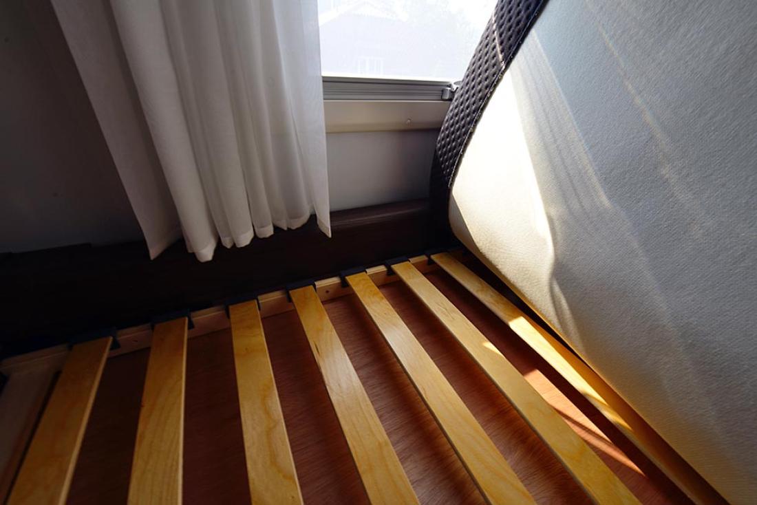 Det er vannbåren Alde-varme i bilen, en stillegående og pålitelig varmekilde som fungerer etter konveksjonsprinsippet. Det betyr at det skapes en sirkulerende luftstrøm i bodelen. Den starter med oppvarming av luft via tynne varme aluminiumsplater plassert bak møblene. Varm luft stiger når den kommer i kontakt med en konvektor, den avkjøles og fallerså med igjen, før den på nytt varmes opp av konvektoren. Et avansert system som stiller krav til utformingen på møblementet da luftstrømmen ikke må blokkeres. Uansett hvor jeg sjekker i denne modellen, ser det bra ut. Luftspalter bak møblene, rundt sengene og inni overskapene. Rundt sengen finnes det en risiko for at man stopper luftstrømmene med sengeklær, så en høyrere sideplate hadde vært bra. I førerhuset er en varmematte koblet til systemet. Dobbeltgulvet føles varmt, så det er ikke behov for tøfler.
