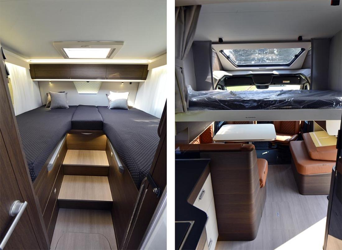 Garasjen er stor og godt innredet, her får man plass til en hel del. Under sengene finnes det en garderobe og to oppbevaringsskuffer. Det er ikke spesielt mange overskap, tre i soverommet og fire under senkesengen. Men der skal motoren til den elektriske senkesengen ha plass og det går på bekostning av plass til andre ting. Bilen har teknisk dobbeltgulv, men dette kan ikke benyttes til lagring. Er man to om bord er det grei lagringsplass, men for en familie på fire krever det god planlegging.