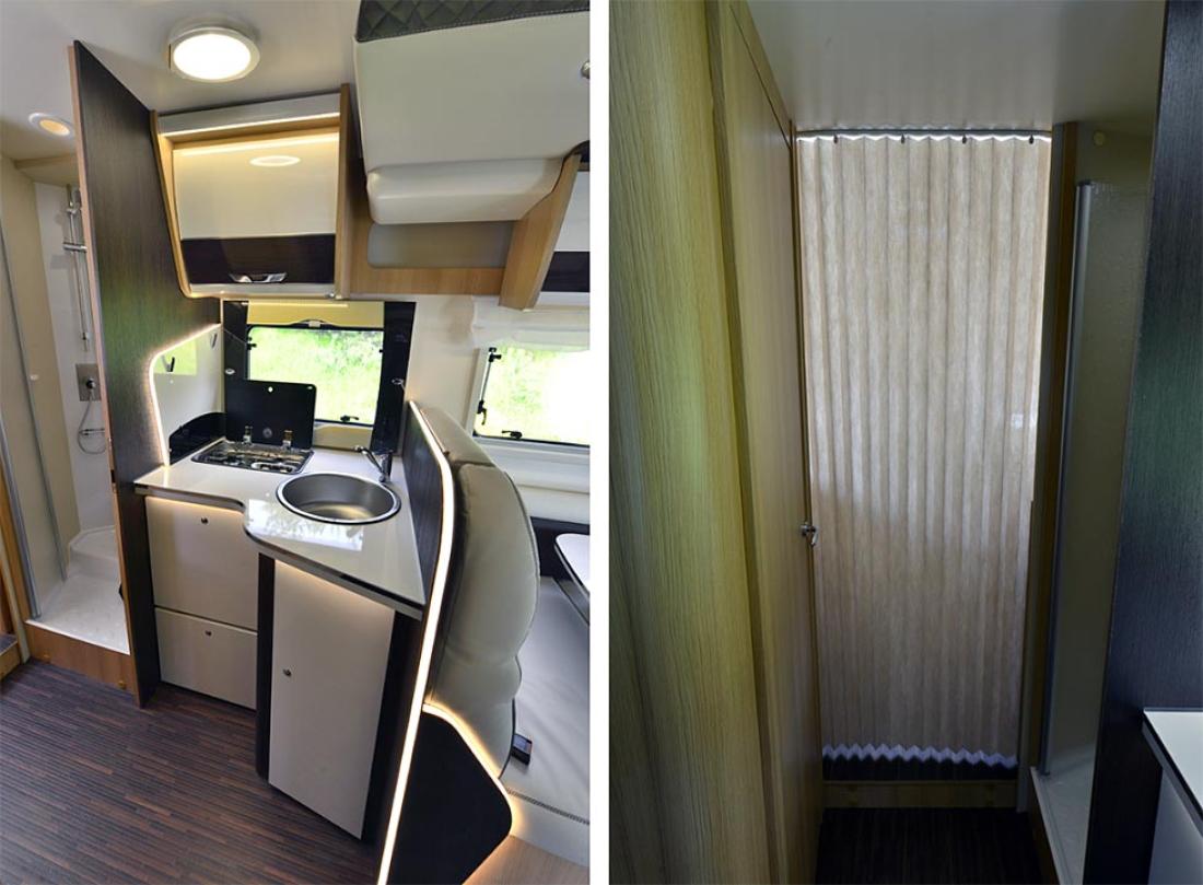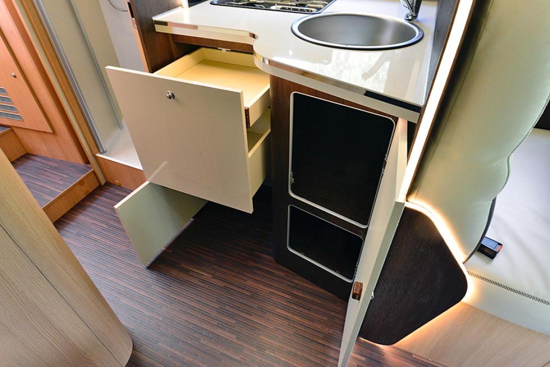 Å få plass til alt du trenger på ferieturen bør ikke være noen stor utfordring i denne modellen. Det er en stor garasje for uhåndterlige ting, to store skap til klær og overskap til resten. Kjøkkenet har i tillegg god oppbevaringsplass. Ikke glem at det store og dype skapet er vanskelig å få oversikt i, men dette kan løses med et par skuffer.