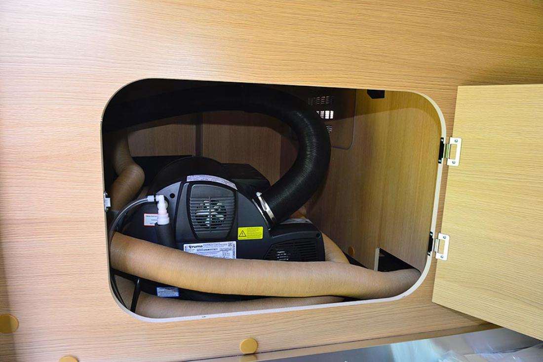 Denne modellen er ikke beregnet på fricamping og vinterbruk, men importøren har utstyrt den for å klare vintercamping med el-tilkobling. Det er en stor 6kW Truma-varmer med el-patron og et elektrisk oppvarmet gulv. Bak sittegruppe og overskap er det luftspalter. Overskapene har til og med en indre vegg bak, som gjør at luften kan stige uten risiko for at sirkulasjonen blokkeres av det man har i skapet. Rundt sengene er det også luftspalter som bidrar til å spre varmen godt. Det medfølger et isoleringstrekk til frontruten.