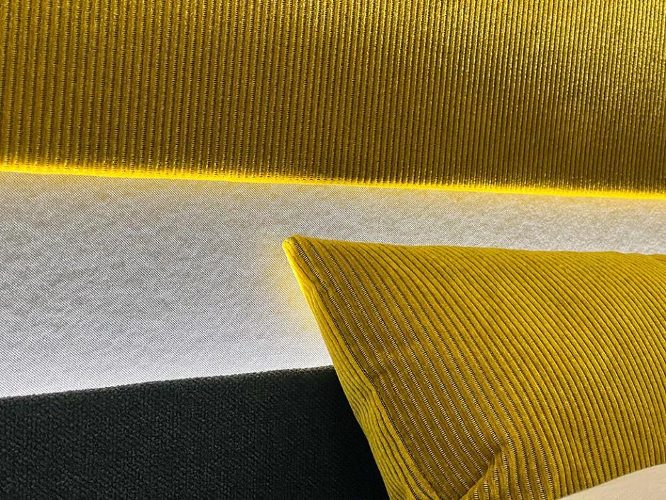 Interiøret er over gjennomsnittlig friskt, synes jeg. Det fungerer skikkelig bra med fargerike kordfløyel-tekstiler i kombinasjon med en diskret fargeskala på resten av interiøret. Veggene er kledd med tekstiler, og det gir umiddelbart en kvalitetsfølelse.