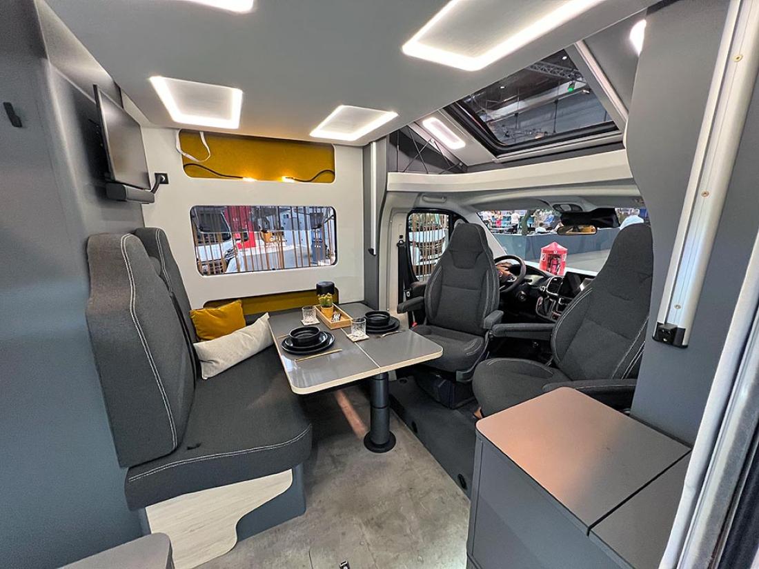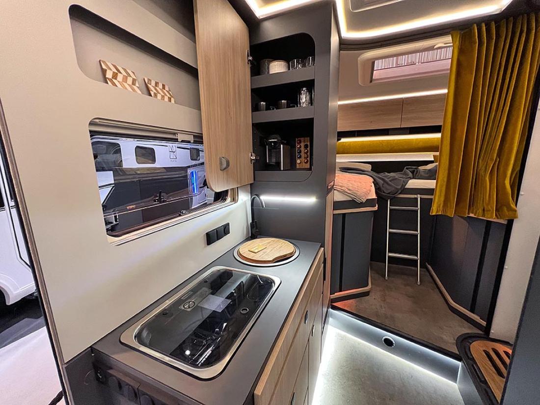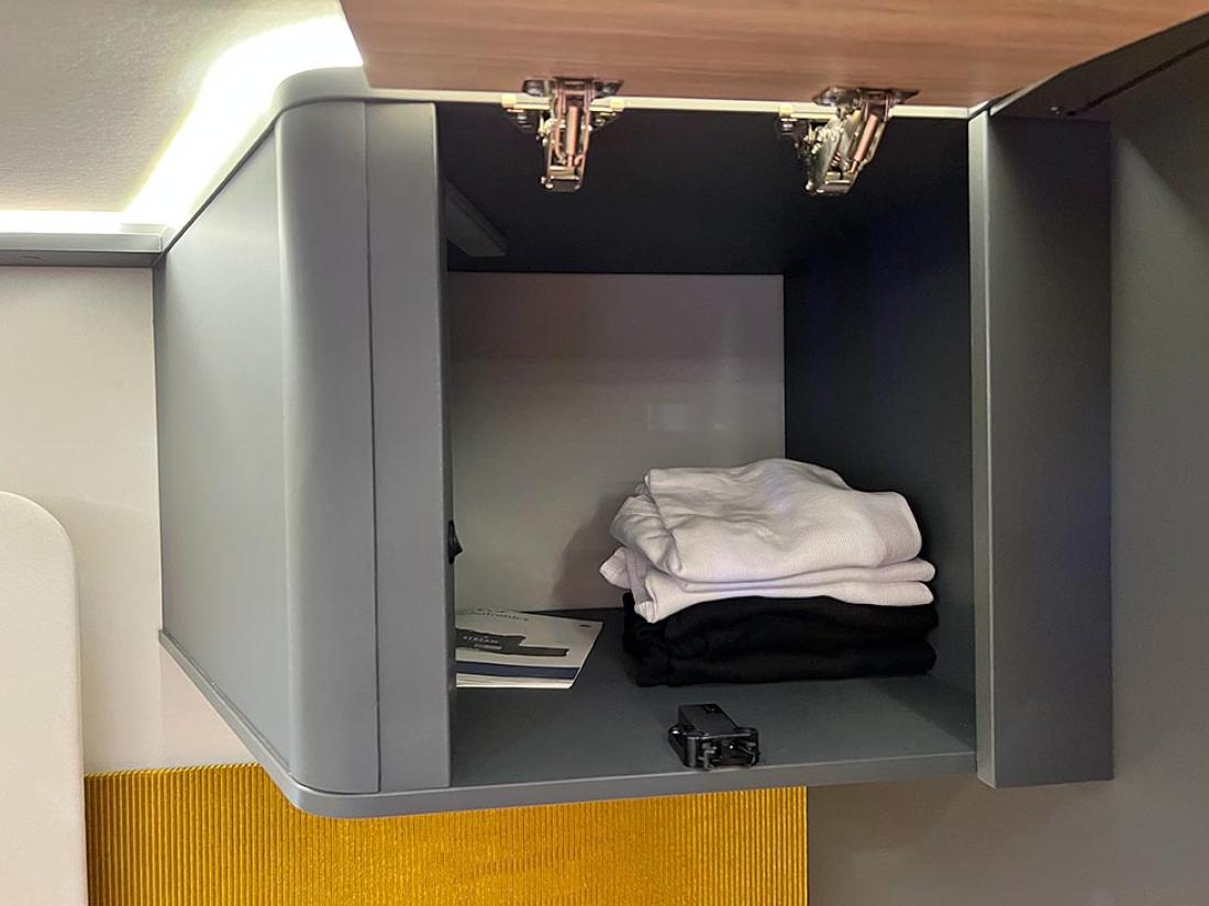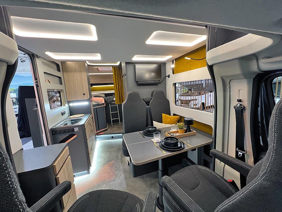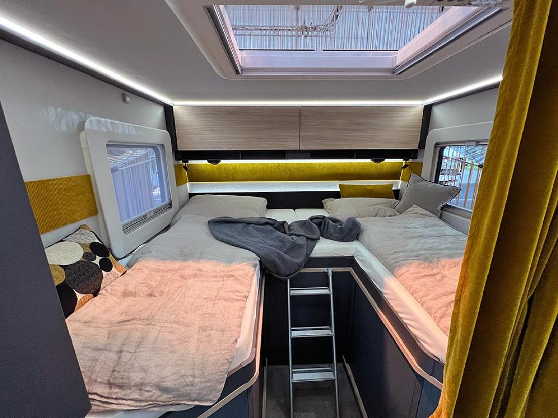 Selv oppgir Frankia tre punkter som gjør modellen unik: plass, design og lys. Her er ingen gardiner eller trappetrinn. Og det er kun overskap på soverommet. Jeg kjenner igjen mye av tankegangen fra Neo. Frankia puttet inn mye energi og utviklingsressurser i den halvintegrerte modellen da den ble lansert i 2019. Blant annet var det gjort mye for å gjøre modellen lettere, og det kjenner man igjen på Now. I stedet for overskap er det hyller og strikker. Det sparer vekt og gir en luftig følelse.
